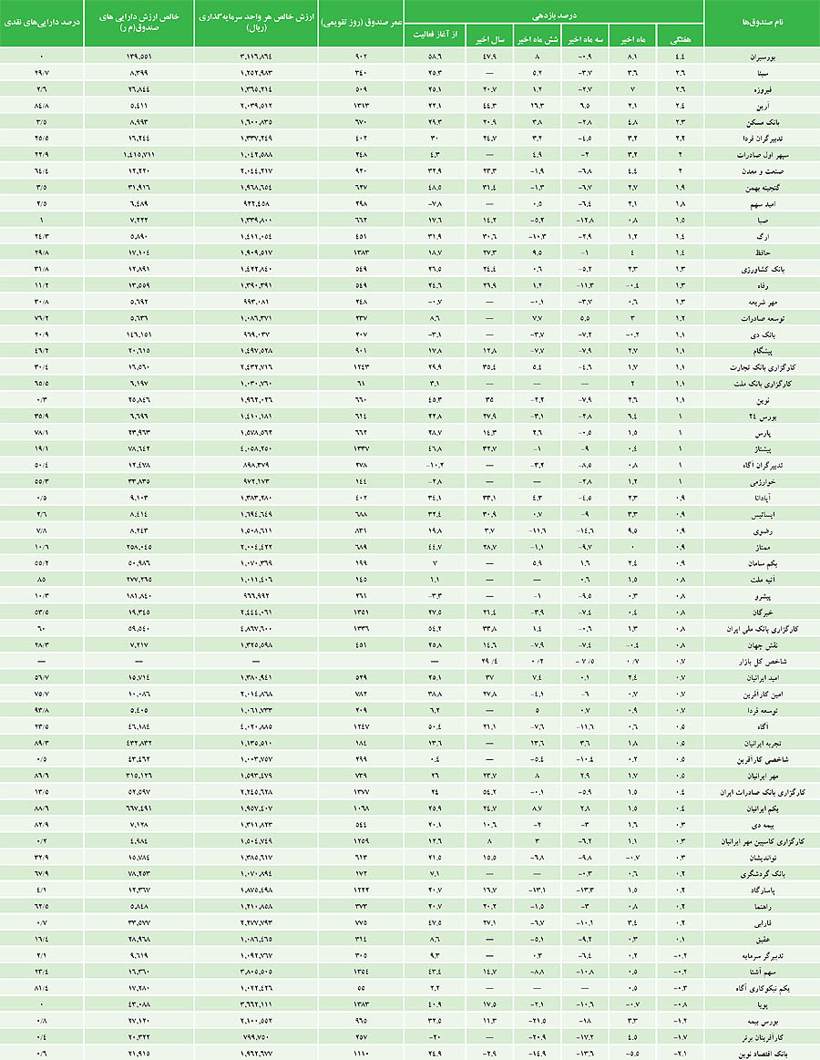 پس از فروكش كردن موج ابطال در صندوقهاي سرمايهگذاري كه البته خروج بخش عمدهاي از سرمايهگذاران حقيقي را به همراه داشت، صندوقهاي سرمايهگذاري با آرامش نسبي مواجه شدهاند و رفتهرفته با بهبود بازار ميتوانند به بازگشت ارزش واحدهاي از دست رفته خود اميدوار باشند. كارنامه صندوقها طي سه هفته گذشته نشان ميدهد كه اين نهادهاي مالي با بازدهي به مراتب بهتري مواجه شدهاند تا جايي كه تعداد صندوقهاي با بازدهي منفي به شدت كاهش يافته است. همزمان، چرخش دلاري بورس اوراق بهادار نيز به كمك صندوقهاي سرمايهگذاري كه سهام با ارزش خود را حفظ كردهاند شتافته است تا با بهره گرفتن از تاثير مثبت رشد دلار در شركتهاي صادركننده، رشد صندوقهايي كه سهام بنيادي خود را نگهداري كردهاند، محقق شود. به اين ترتيب در عملكرد هفتگي منتهي به 13 ديماه، شاخص بورس اوراق بهادار در حالي بازدهي 7/0 درصدي داشت كه 37 صندوق سرمايهگذاري بازدهي بالاتري از آن را كسب كردند. بورسيران با ثبت بازدهي 4/4 درصدي رتبه نخست را ثبت كرد و صندوقهاي فيروزه، سينا، آرين و بانك مسكن به ترتيب با كسب بازدهي 6/2، 6/2، 4/2 و 3/2 درصدي رتبههاي بعدي را به خود اختصاص دادند. بر اين اساس، 7 صندوق بازدهي بالاتر از 2 درصد، 19 صندوق بازدهي بالاتر از يك درصد و 27 صندوق بازدهي مثبت زير يك درصد داشتند. اين در حالي است كه صندوق بانك اقتصاد نوين با بازدهي منفي 1/2 درصدي در قعر جدول عملكرد هفتگي صندوقهاي سرمايهگذاري قرار گرفت. همچنين صندوق سهم آشنا، تدبيرگر سرمايه، يكم نيكوكاري آگاه، پويا، بورس بيمه و كارآفرينان برتر ديگر صندوقهاي با بازدهي منفي در هفته گذشته بودند. كارنامه مثبت ماهانه صندوقها بنابر اين گزارش، بازدهي صندوقهاي سرمايهگذاري در يك ماه اخير نشاندهنده سبقت قاطعانه صندوقهاي سرمايهگذاري از شاخص بورس تهران است. بر اين اساس بازدهي 41 صندوق سرمايهگذاري از بورس تهران فراتر رفت. شاخص در حالي در اين دوره بازدهي 71/0 درصدي را به ثبت رسانده است كه صندوق رضوي با 5/9 درصد بازدهي مثبت صدرنشين بود. از سوي ديگر بورسيران، فيروزه و بورس 24 با فاصله زياد از ساير صندوقها به ترتيب بازدهي 1/8، 7 و 4/6 درصدي را كسب كردهاند. اين در حالي است كه در يك ماه اخير تنها 7 صندوق سرمايهگذاري بازدهي منفي داشتند كه بانك اقتصاد نوين با كسب بازدهي منفي 5/5 درصدي ضعيفترين عملكرد را به ثبت رسانده است. صندوقها در سال 2011 عملكرد يك سال اخير صندوقها كه تقريبا منطبق با سال 2011 ميلادي است حاكي از آن است كه صندوقهاي سرمايهگذاري در اين دوره نتوانستند از شاخص بازار پيشي بگيرند. بر اين اساس، بازدهي بورس در يك سال اخير به 4/29 درصد رسيد و به اين ترتيب 12 صندوق سرمايهگذاري جايگاه بالاتري از شاخص داشتند. كارگزاري بانك صادرات با كسب بازدهي 2/54 درصد، بورسيران با بازدهي 9/47 درصد و آرين با بازدهي 3/44 درصد به ترتيب رتبههاي اول تا سوم را در اختيار گرفتند. اين در حالي است كه عمر تقويمي 21 صندوق سرمايهگذاري كمتر از يك سال است. در اين ميان، تنها صندوق بانك اقتصاد نوين در عملكرد يك سال اخير بازدهي منفي 9/2 درصدي را ثبت كرده است. به پیوست جدول عملکرد صندوقهای سرمایه گذاری در هفته منتهی به 13 دی ماه 90 که بر اساس بازدهی هفتگی مرتب شده است، آمده. |