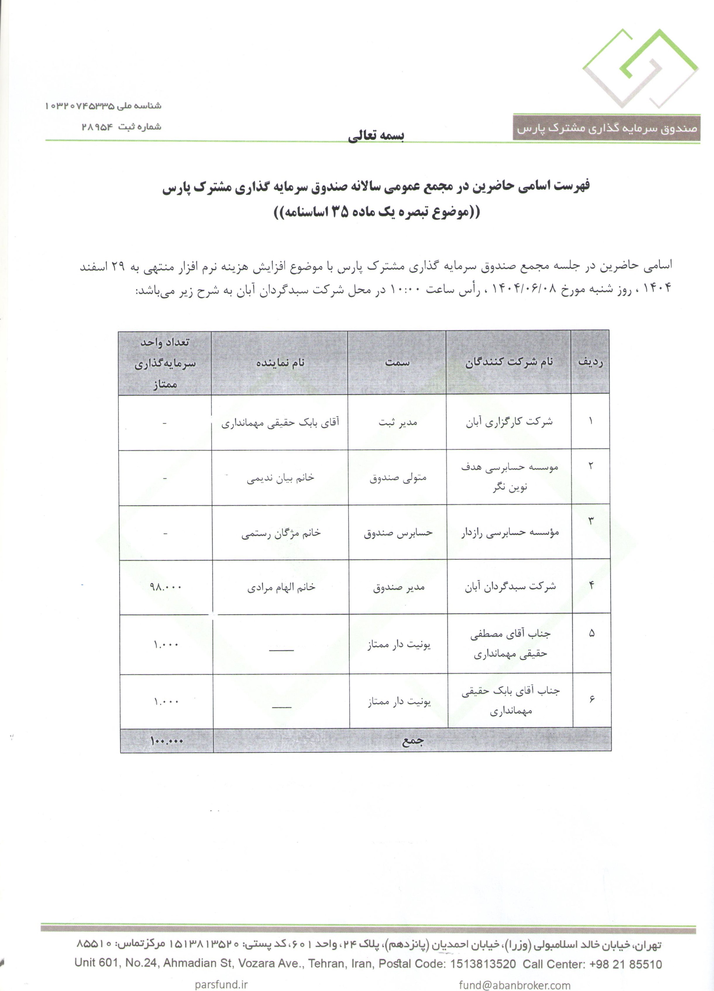 فهرست اسامی مجمع صندوق سرمایه گذاری مشترک پارس با موضوع افزایش هزینه نرم افزار منتهی به ۲۹ اسفند ۱۴۰۴ مورخ ۱۴۰۴/۰۶/۰۸ ساعت ۱۰:۰۰