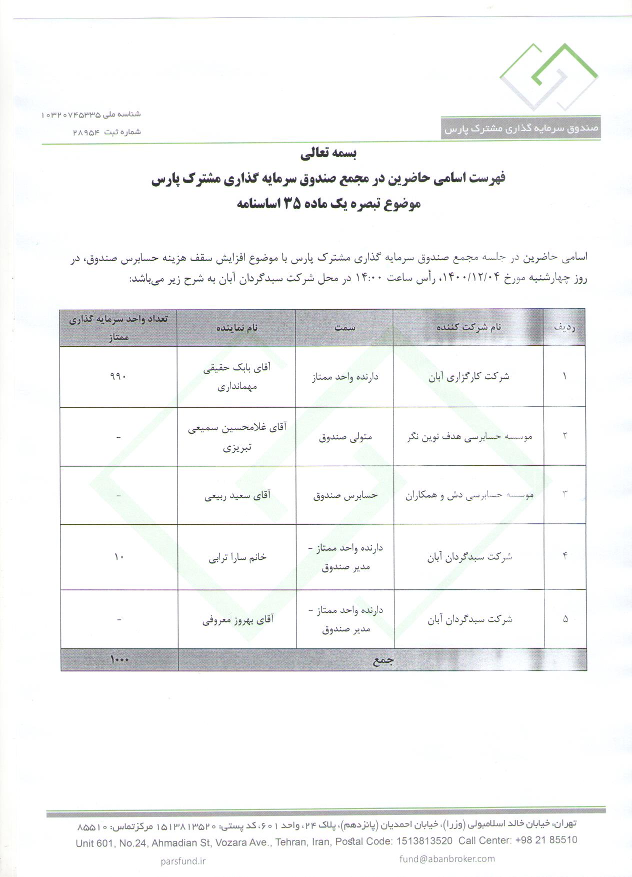 اسامی حاضرین در مجمع با موضوع افزایش سقف هزینه حسابرس صندوق و سایر موارد مورخ 1400/12/04