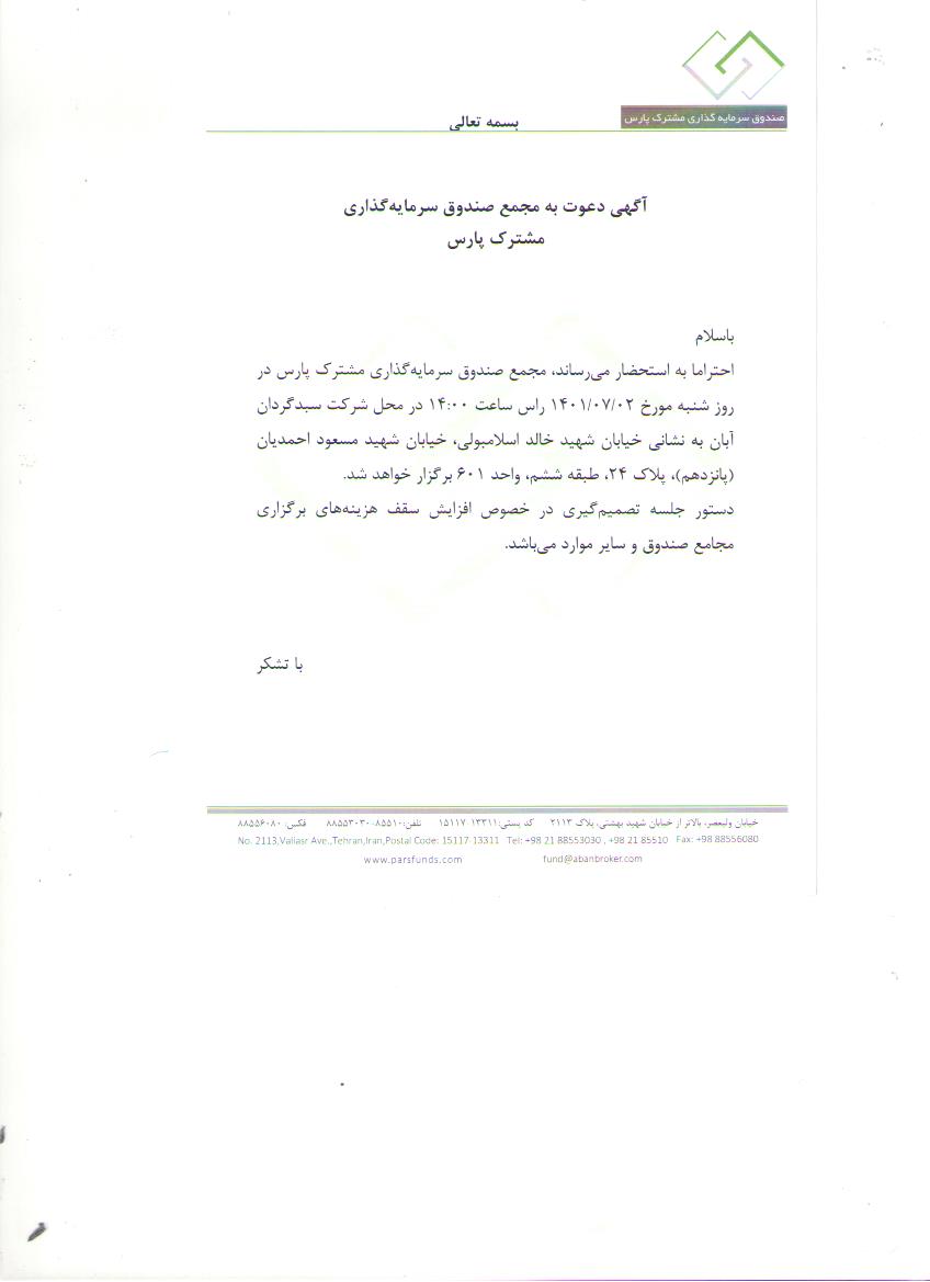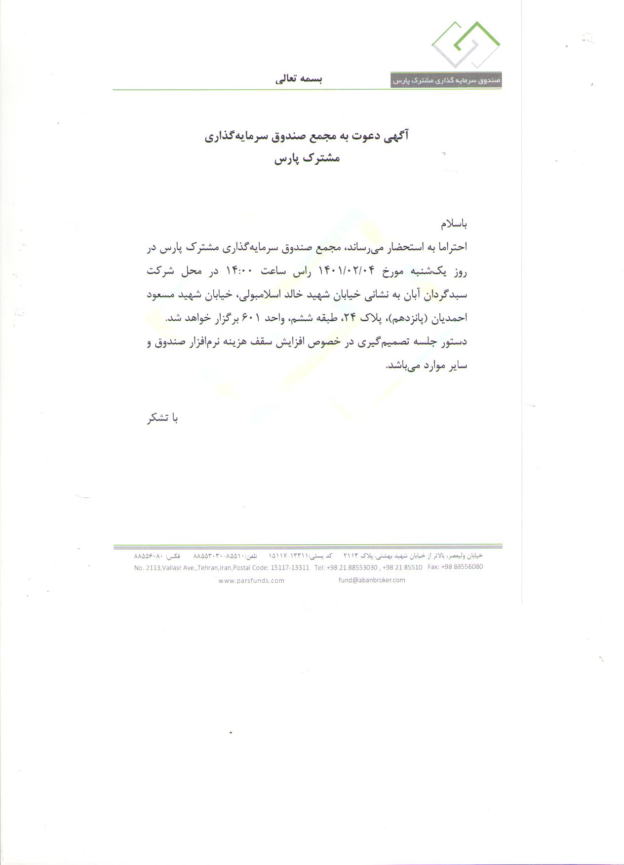 تاییدیه مجمع صندوق مشترک پارس با موضوع افزایش سقف هزینه نرم افزار صندوق و سایر موارد مورخ 1401/02/04