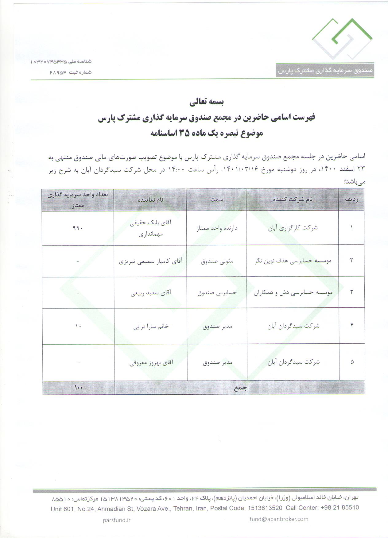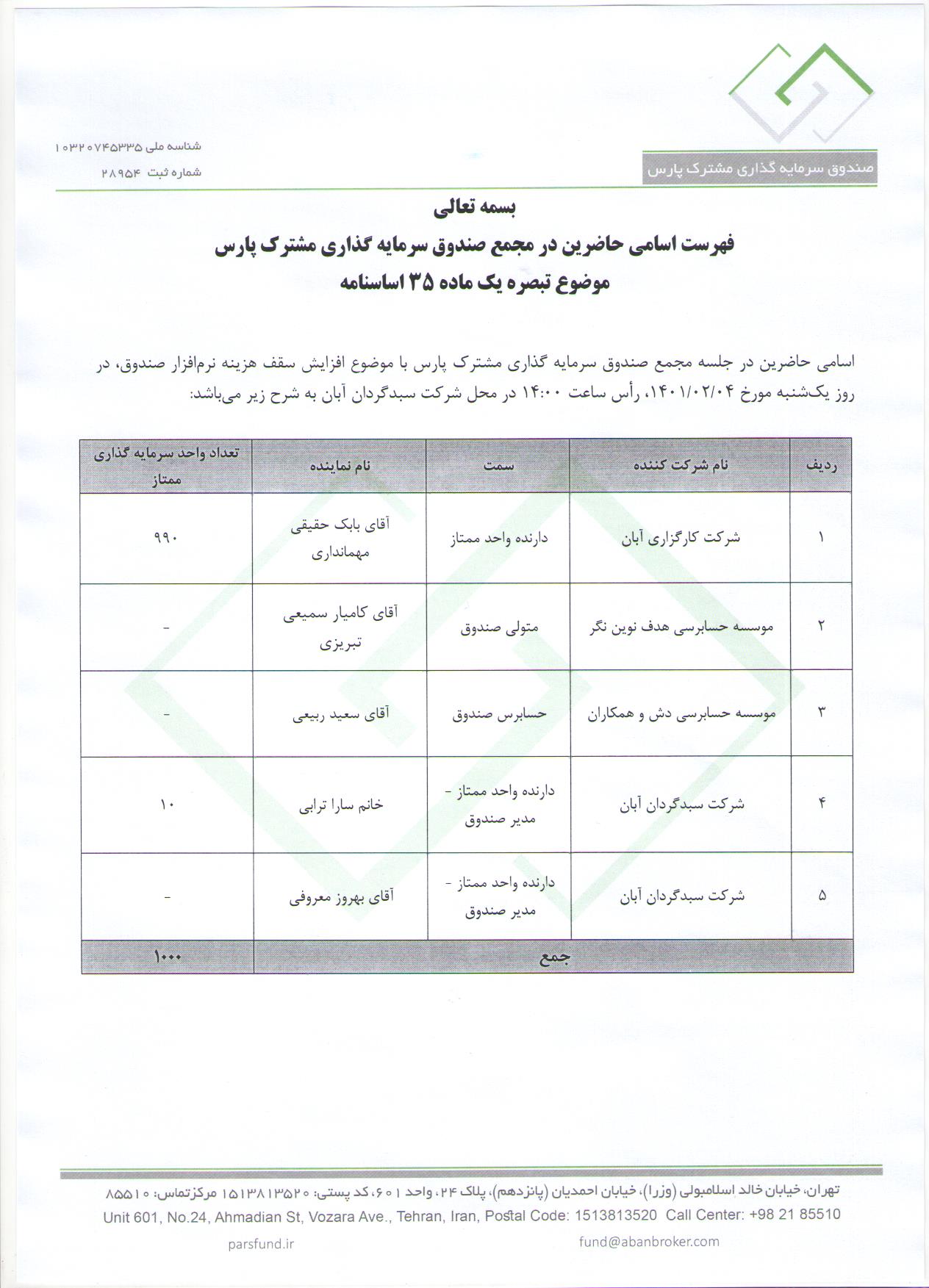 اسامی حاضرین در مجمع صندوق مشترک پارس با موضوع افزایش سقف هزینه نرم افزار صندوق و سایر موارد مورخ 1401/02/04