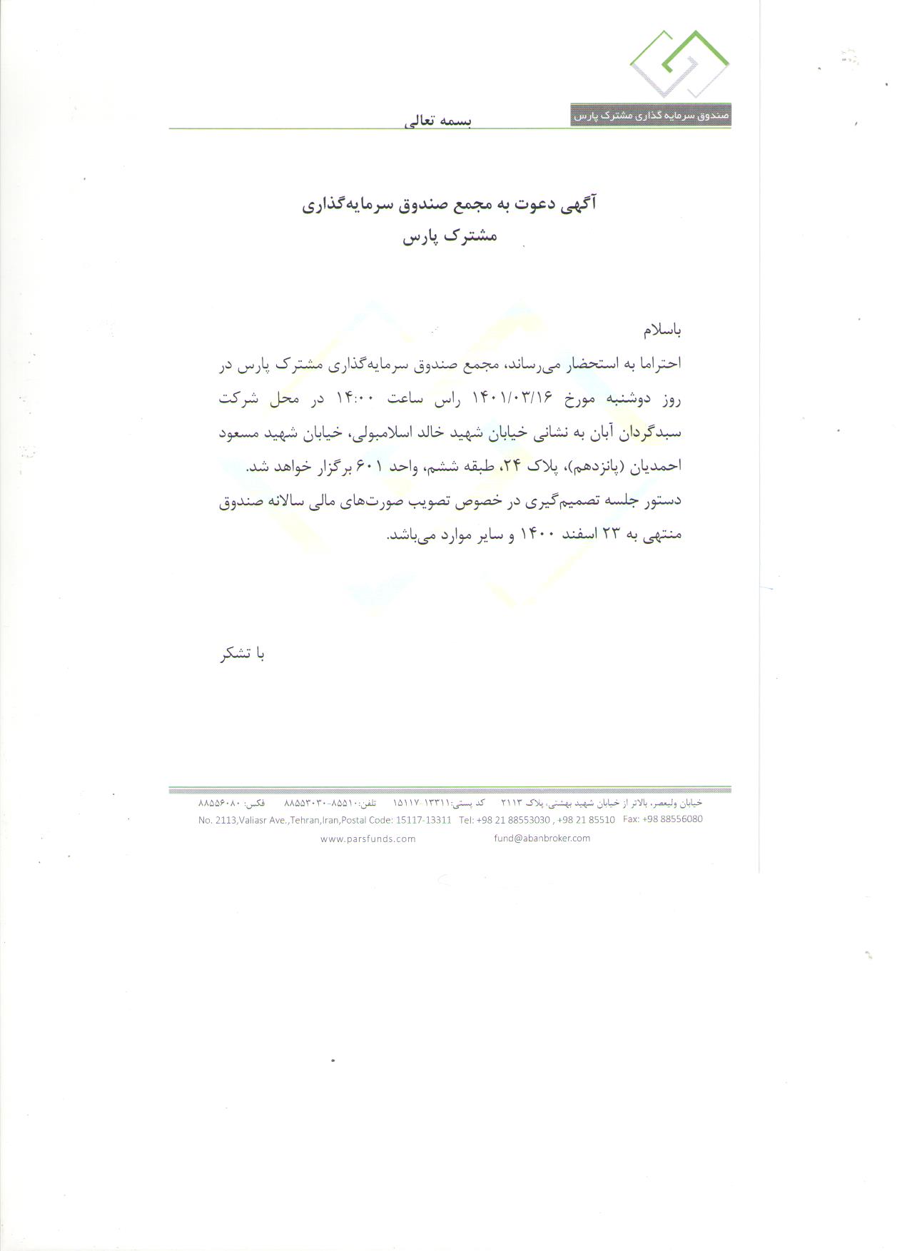 تصمیمات مجمع مورخ 1400/12/04 ساعت 14:00 صندوق مشترک پارس با موضوع تغییر کارمزد حسابرس صندوق