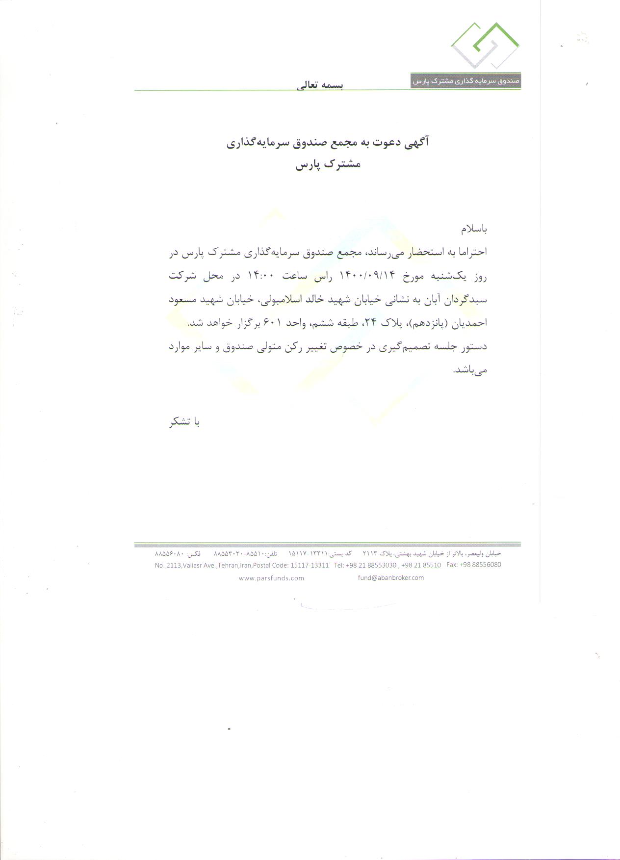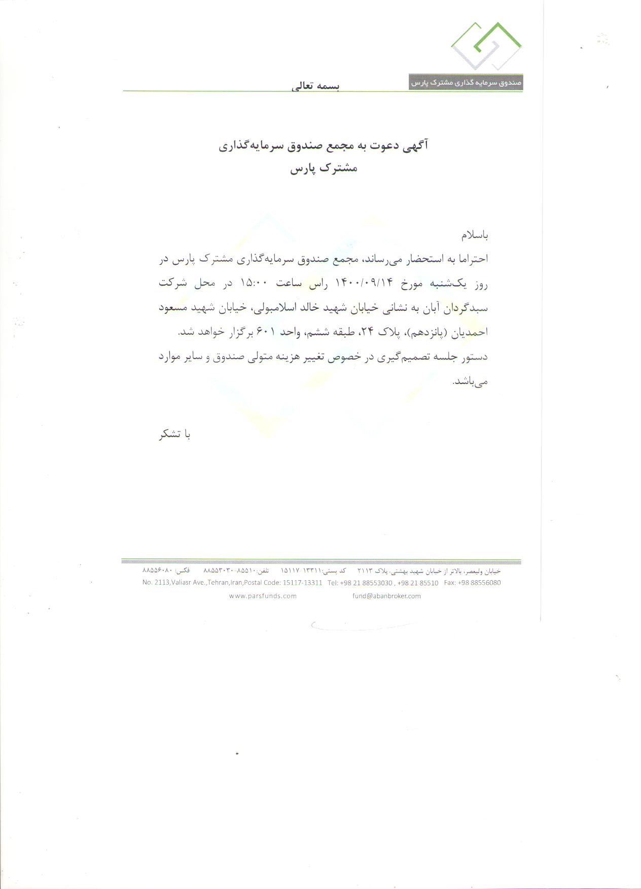 تصمیمات مجمع مورخ 1400/09/14 ساعت 15:00 صندوق مشترک پارس با موضوع تغییر کارمزد متولی صندوق