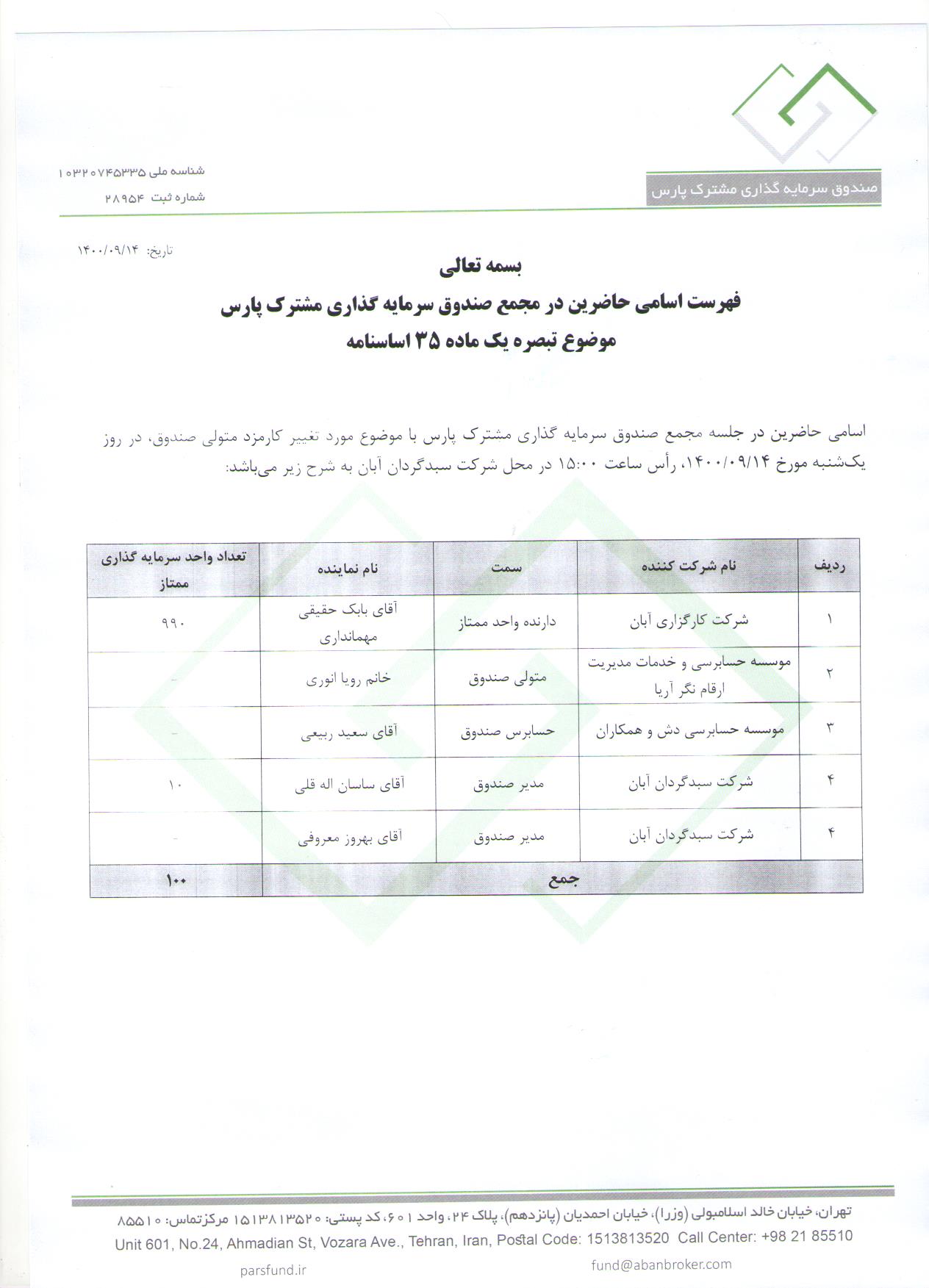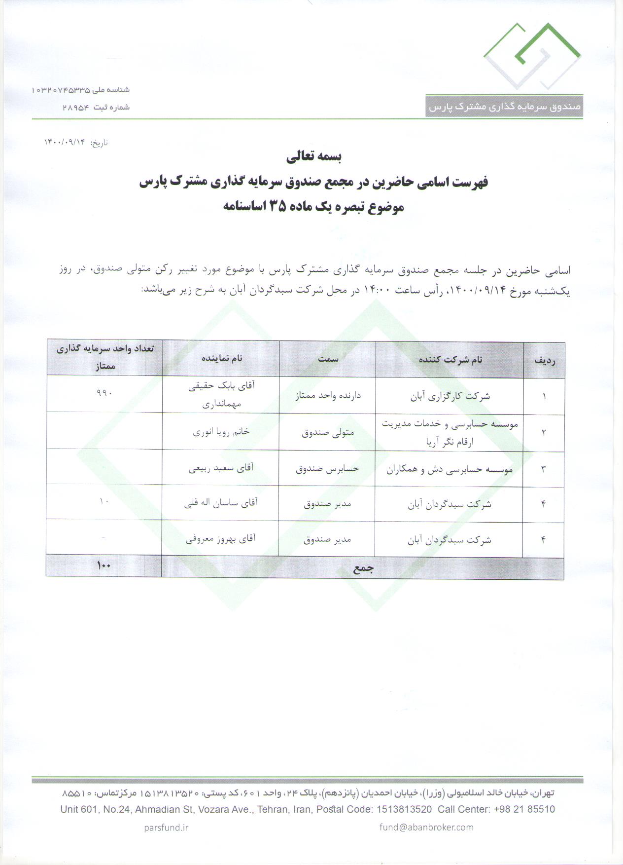 اسامی حاضرین در مجمع با موضوع تغییر کارمزد متولی صندوق مشترک پارس و سایر موارد مورخ 1400/09/14