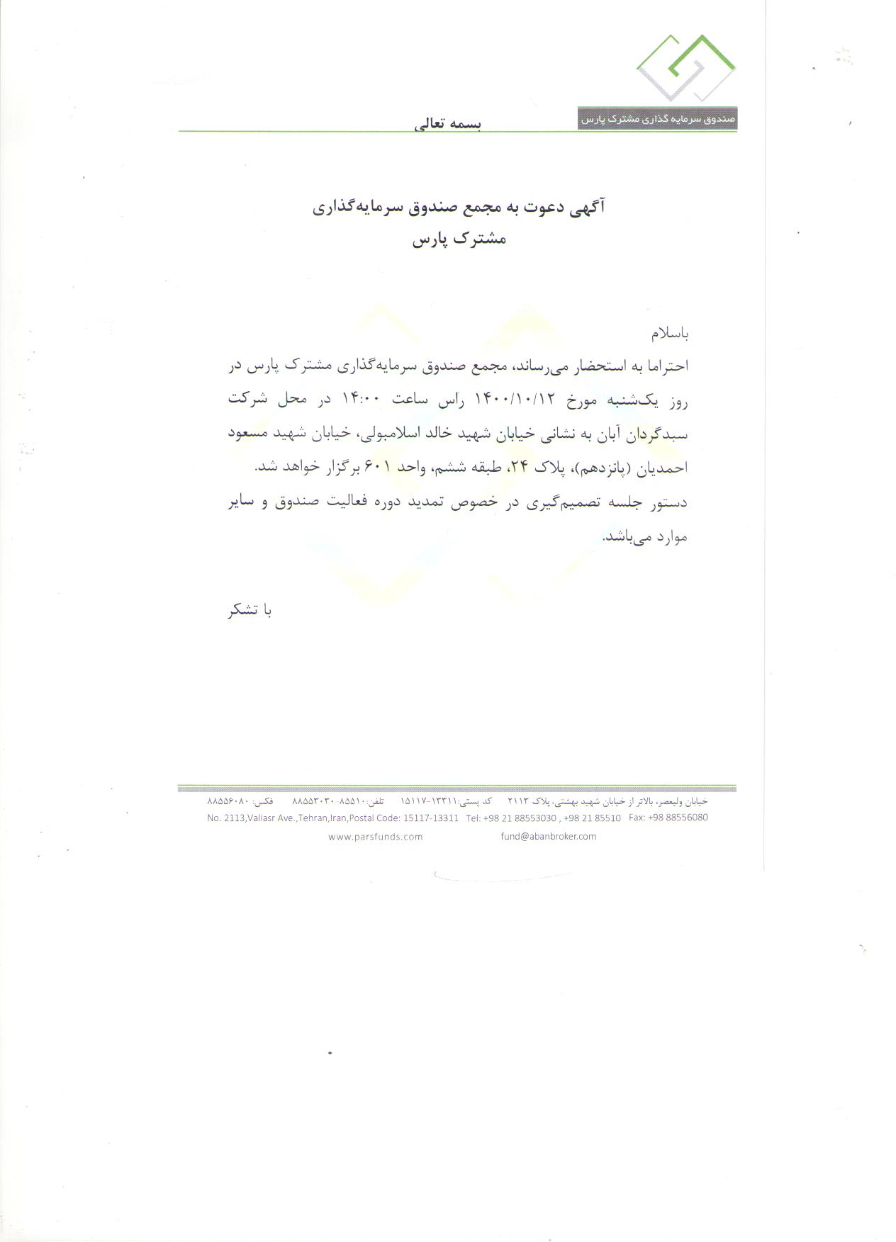 آگهی دعوت به مجمع با موضوع تمدید دوره فعالیت صندوق و سایر موارد مورخ 1400/10/12