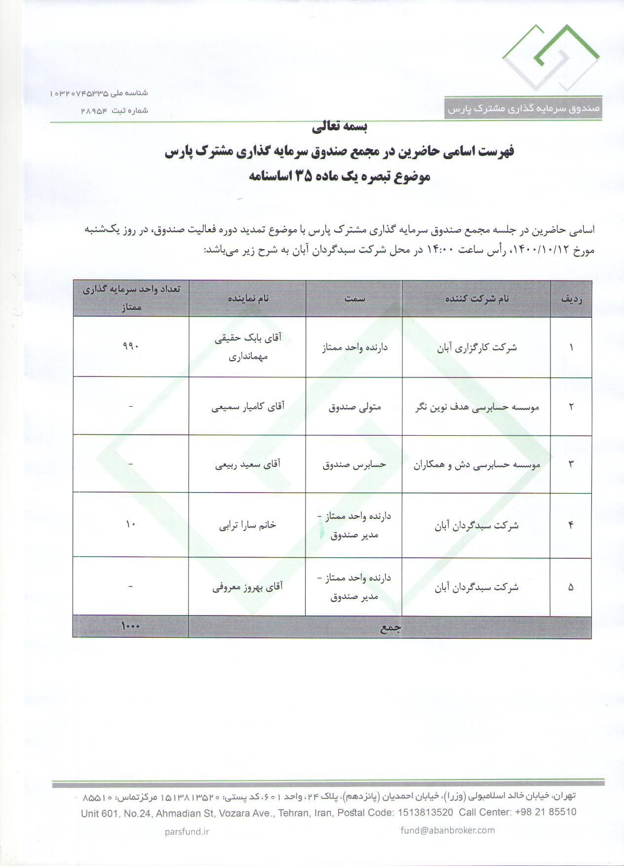 اسامی حاضرین در مجمع با موضوع تغییر رکن متولی صندوق مشترک پارس و سایر موارد مورخ 1400/09/14