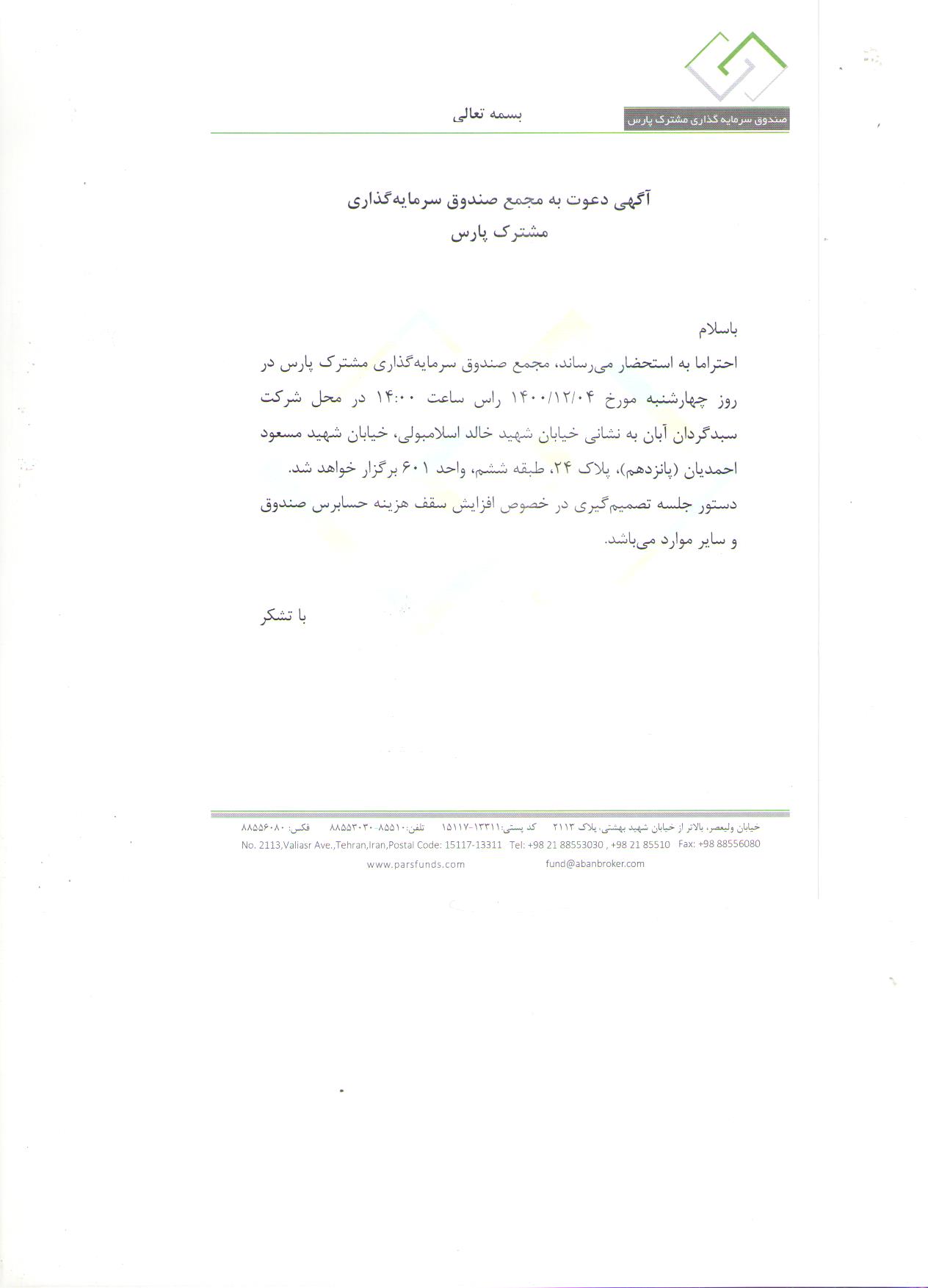 آگهی دعوت به مجمع با موضوع افزایش سقف هزینه حسابرس صندوق و سایر موارد مورخ 1400/12/04